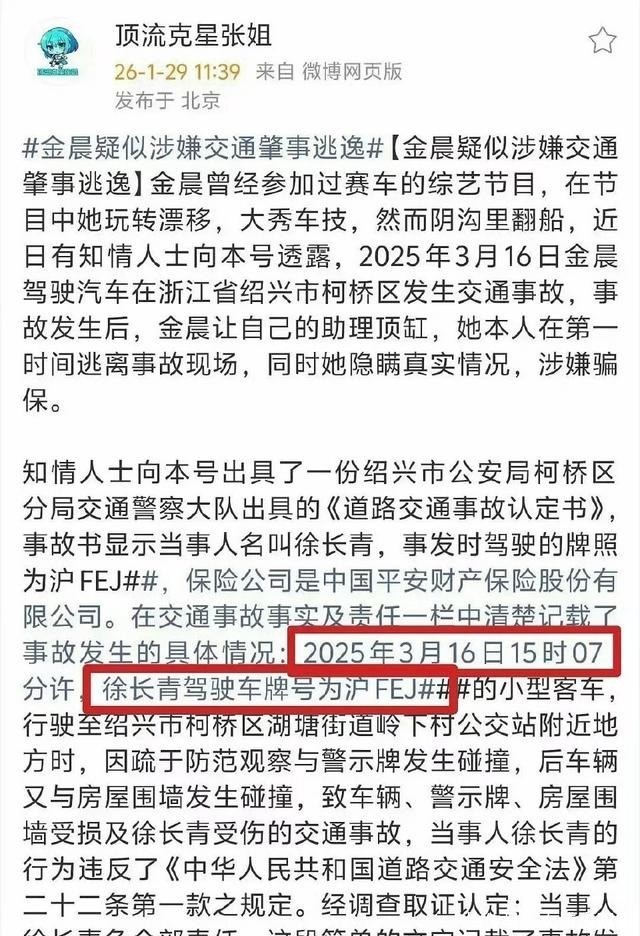 事情是这样的,2025年3月16日下午三点,绍兴柯桥区一个村口,一辆挂着沪F牌照的黑色越野车冲出去了。现场撞烂了警示牌和围墙,车上助理徐长青受了点轻伤。交警当时来处理,认定徐长青是驾驶员,让他担全责。但最近爆料说,开车的根本是金晨自己,撞完她和经纪人躲起来,让助理去认错。